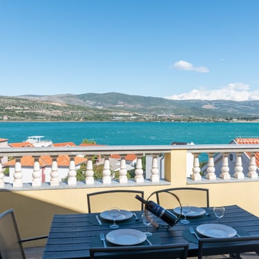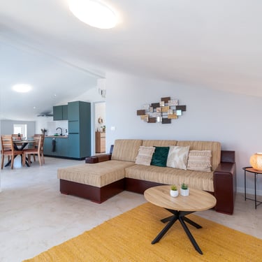 A living room with dining table, TV area, large sofa and dining area opens onto a spacious 20m² sea-view terrace, and air conditioning is also available. It is spacious and ideal for 5 people. You can also enjoy the television and many international channels