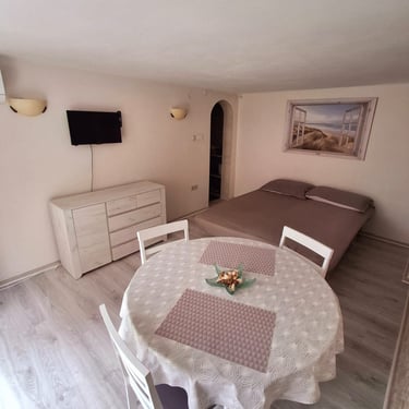 There's also a lounge with a dining table, a TV area, plenty of storage space, a large 150x190cm sofa bed, an outdoor dining area and air conditioning. It's spacious and ideal for a 2-person stay, and you'll also be able to watch TV with lots of international channels